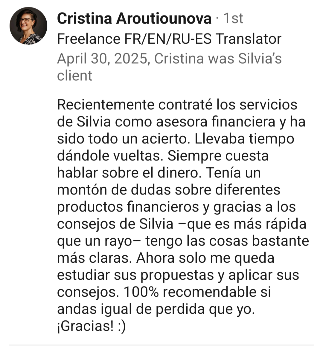Muchos asesores trabajan para bancos, fondos o aseguradoras y solo recomiendan sus productos. Yo soy asesora independiente y solo te aconsejaré lo que más te convenga según tu perfil. No recibo comisiones.